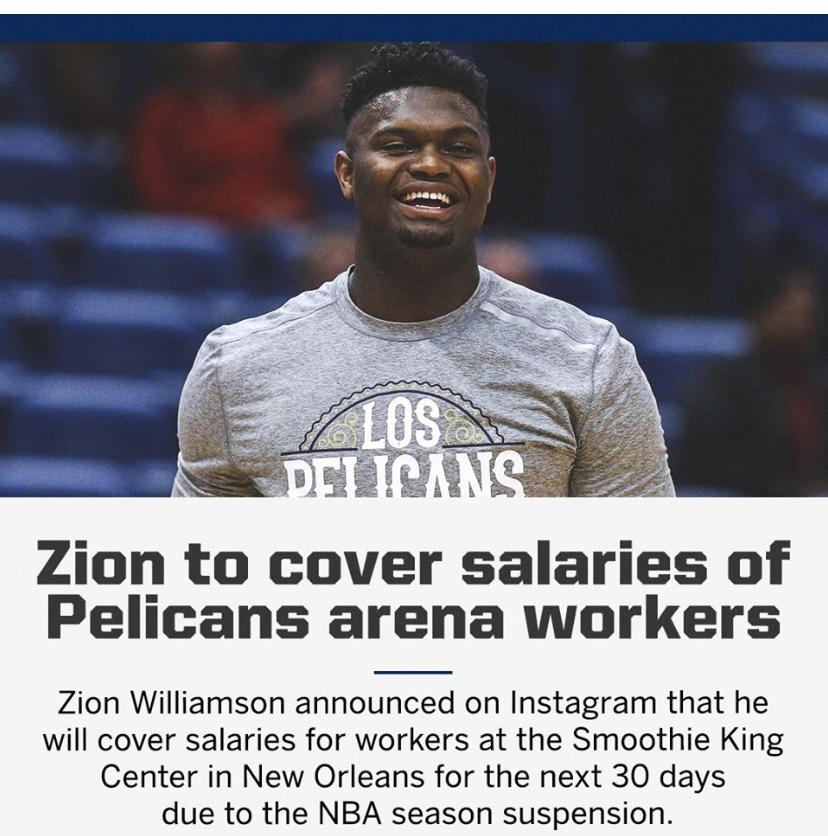 Zion Williamson (19) will cover salaries of Pelican workers for the next 30 days.
