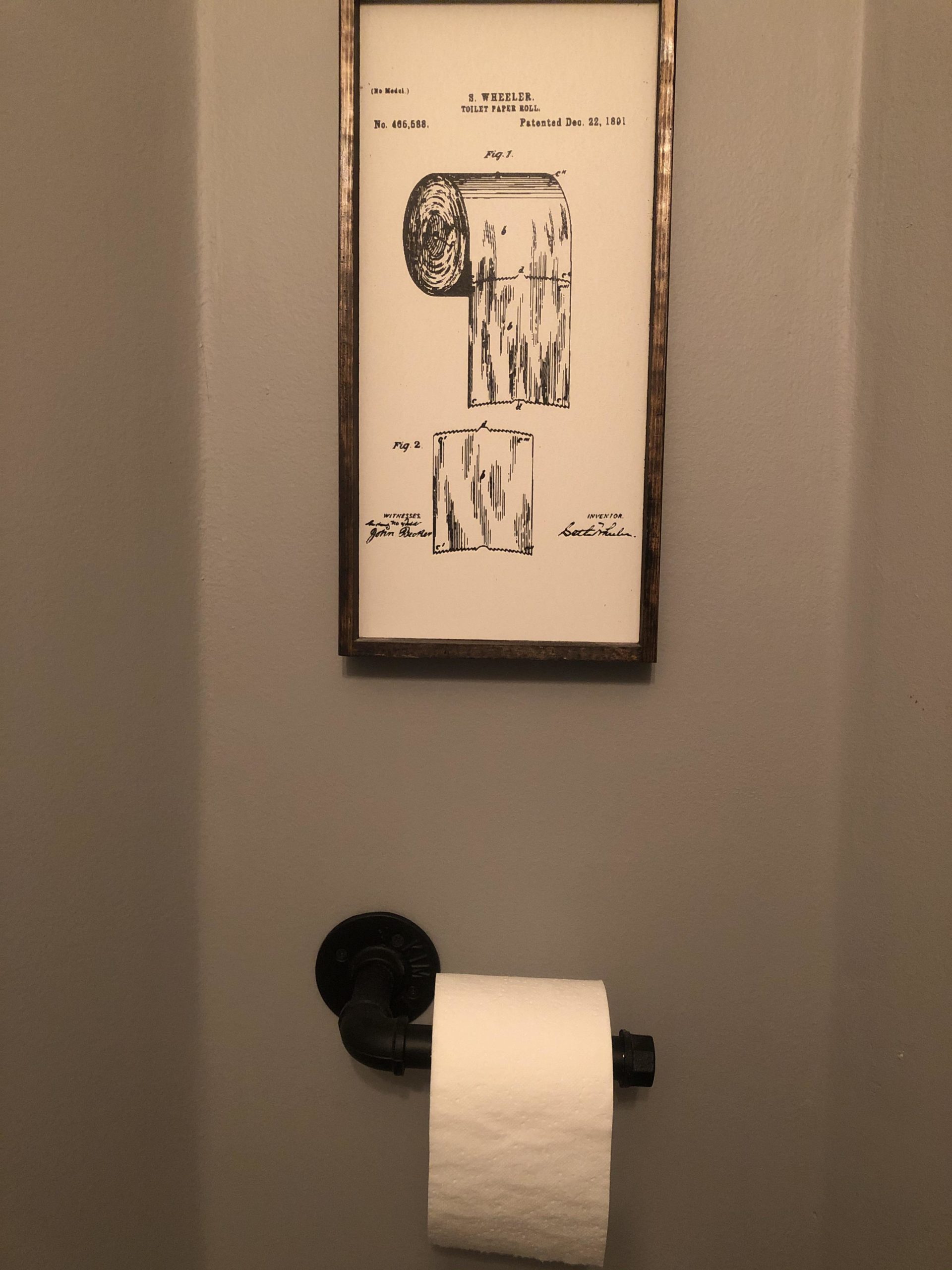 A sign to explain how to properly hang a toilet paper roll.