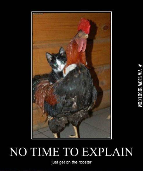 No time to explain, just get on the rooster!