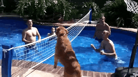 Dog plays ball with his family.