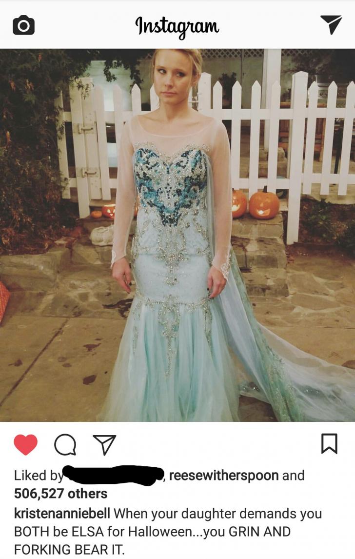 Kristen Bell, the voice of Anna in Frozen, had to be Elsa for Halloween, because her daughter made her do it.